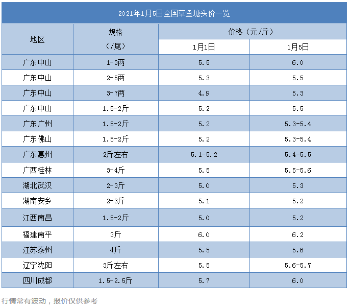 江苏:泰州4斤草鱼卖5.6元/斤,5斤草鱼报5.9元/斤,四天鱼价回涨0.1元/斤左右。养鱼户卖鱼积极,随着草鱼存塘量的减少,大部分养户看好后市鱼价。连云港当地草鱼存塘健康情况良好,由于塘口封冻出鱼难,养户出鱼积极性一般。