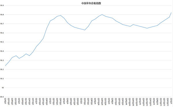 受生猪价格持续上涨影响,最近南方多地猪肉价格再次进入“30元时代”。受猪肉价格上涨刺激,加上全国草鱼存量大幅减少,气温持续下降造成养户出鱼困难增加,全国草鱼整体行情呈现全线回暖态势。2021年1月5日,中国草鱼价格指数收报90.82点,比2021年1月1日的90.77点上涨0.05点。
