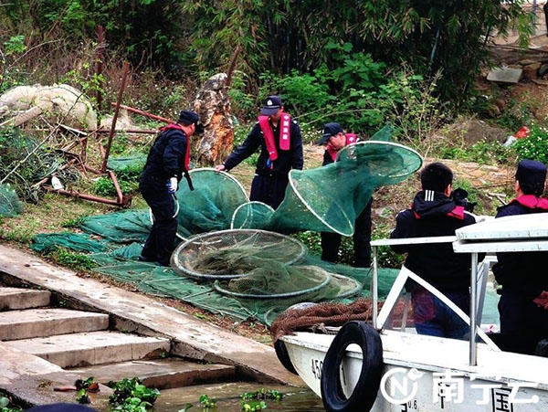 执法人员在岸边发现了许多由渔网制成的“迷魂阵” 。记者程勇可 摄