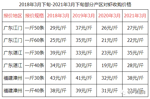从水产养殖网跟踪的情况来看,江门湛江漳州等三个产区,3月份下旬里差价总体还是很大的,其中2019年3月下旬江门50条对虾最高疯涨到37元/斤,其余年份均在30元/斤以下,“清明节钱价格波动还是很大的,尤其是疫情过后,今年处于市场恢复期,临近清明,虾价应该还会涨,但涨到什么程度就不好说了。而且不少手里有虾的养殖户都想在清明出虾的话,其实也存在一定的风险”。