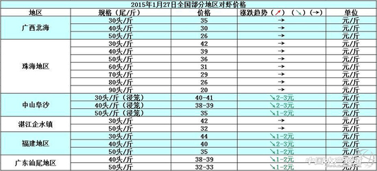 据悉,最近半个多月以来,各地的对虾塘边价上涨速度快、幅度大,但是各地的市场却无法承受过高的价格,致使各地的市场消费量大大减少,市场出现“烂市”现象。近两天各地的市场销售量依旧低迷,虾价也出现不同程度的下降。具体价格如下: