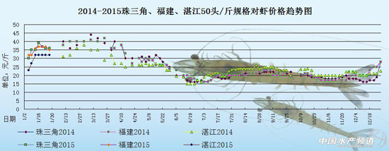下图是2014年和2015年珠三角地区、湛江地区和福建地区50头/斤规格对虾的价格趋势图。2015年年初,元旦刚过,各地存塘的虾非常少,各地虾价都在飙涨。1月中旬,各地的对虾供应无法满足市场的需求,虾价持续上涨中。1月中下旬,因为虾价太过于高企,市场无力承受,对虾市场出现“烂市”现象,个别地区的虾价也有所下滑。具体价格趋势如下: