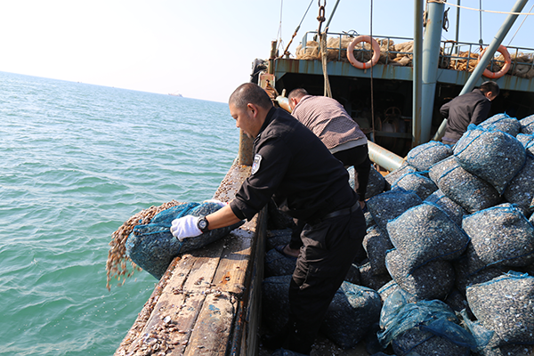 渔政执法人员对涉案巴菲蛤贝幼苗进行放生处理