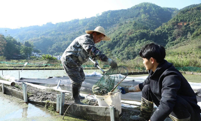 广西农牧水产网讯 稻在田中长,鱼在稻下游。冬季初,在凌云县伶站瑶族乡平兰村的反野生状态菌草循环健康养殖项目示范基地上,到处弥漫着丰收的喜悦,有的抓鱼、装鱼、称鱼......村民们忙碌的身影在田间地头形成一道靓丽的风景线,这标志着凌云县“鱼稻共生”项目初显成效,土塘角鱼、禾花鱼喜获丰收。