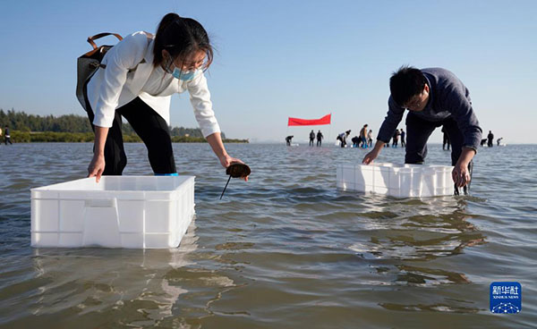 12月4日,在广西北海金海湾红树林生态旅游区,工作人员在放流中国鲎。