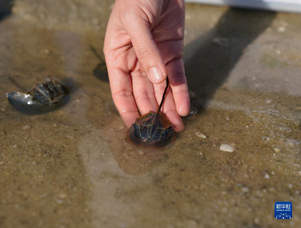 12月4日,在广西北海金海湾红树林生态旅游区,一尾中国鲎被放流入海。