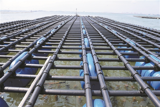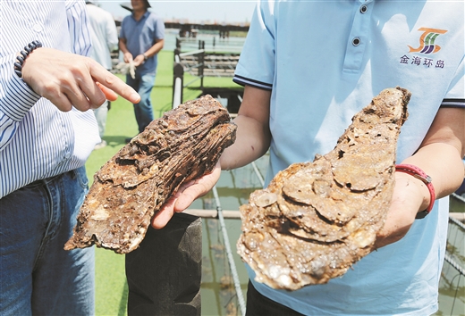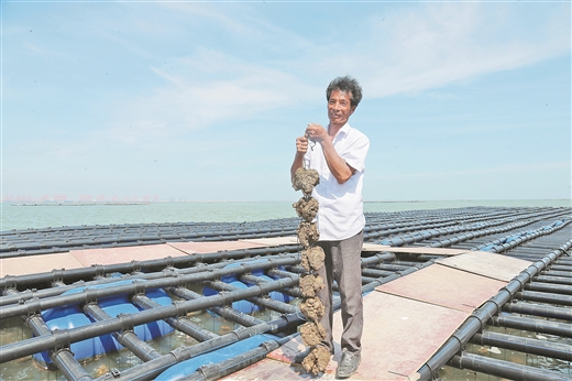 在钦州市大蚝养殖示范区的新型抗风浪蚝排养殖基地,养殖户郑宏明展示养殖的大蚝。