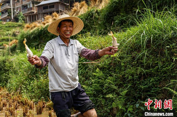 图为在广西融水苗族自治县红水乡良陇村,一名村民在稻田捞取金边鲤。 封荣权 摄