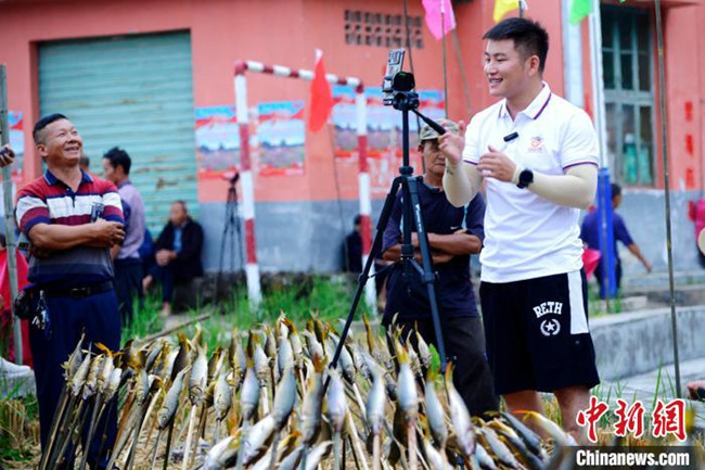 图为在广西融水苗族自治县白云乡枫木村举办的“庆丰收烤鱼展销活动”上,工作人员现场直播销售农副产品。 兰堃 摄