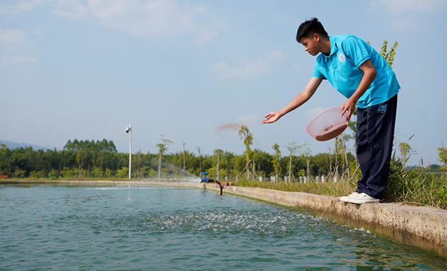 捧着新鱼食的原钊宁又开始了新一轮的投喂,每天给鱼喂食是他最开心的事之一。“看着这些鱼儿慢慢长大,还能回到江里畅游,没有比这更舒心的事了。”原钊宁说。