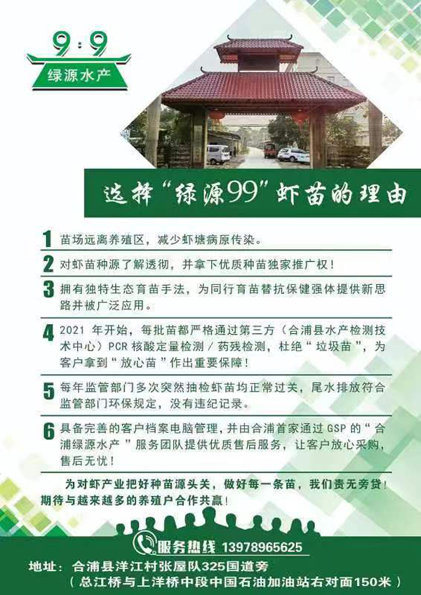 一是得天独厚的区域优势,虾苗场建厂在合浦县星岛湖乡洋江村,远离养殖区,减少虾塘病源传染;二是对虾苗优质种源高度关注,能第一时间拿下优质种苗独家推广权;三是拥有独特的生态育苗技术,使培育出的虾苗抗病力、适应力、存活率更强;四是严把质量关,2021年开始,每批苗在出苗前都严格通过第三方(合浦县水产检测技术中心) PCR核酸定量检测/药残检测、镜检及抗应激测试,确保虾苗健康有活力,杜绝“垃圾苗”流入市场;五是具备完善的客户档案电脑管理,并由合浦首家通过GSP的“合浦绿源水产”服务团队提供优质售后服务,让客户放心采购,售后无忧。