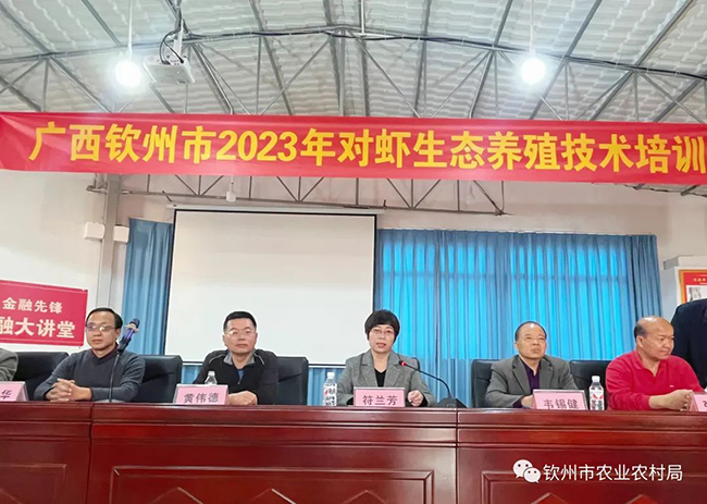 为牢牢把握近年来陆基圆池养殖、小棚养殖等设施渔业快速发展的机遇,交流分享新技术新模式,切实做好我市今年春季对虾养殖生产工作,提高养虾成功率,助农增收、助企增效,推动我市对虾养殖产业高质量发展,3月2日上午,市农业农村局联合广西对虾产业联盟、广西虾业协会在钦州召开2023年对虾生态养殖技术培训班。市农业农村局、市水产技术推广站、钦南区农业农村局、自贸区钦州港片区社会事务局、广西对虾产业联盟、广西虾业协会、广西南美白对虾产业创新团队等相关技术人员、养殖户及涉虾企业代表共90人参加培训班。