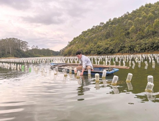 近日,记者走进钦北区大直镇定晓水库的淡水珍珠养殖基地。放眼望去,水面上星罗棋布地漂浮着一个个塑料瓶,它们排列有序,横平竖直,串珠成线,在水光潋滟间勾勒出规整而壮观的几何画卷。取蚌工人驾着小舟轻盈穿梭其间,熟练地挑起网箱,仔细查看着水下珍珠蚌的孕育与生长状况,一派繁忙而有序的生产景象。