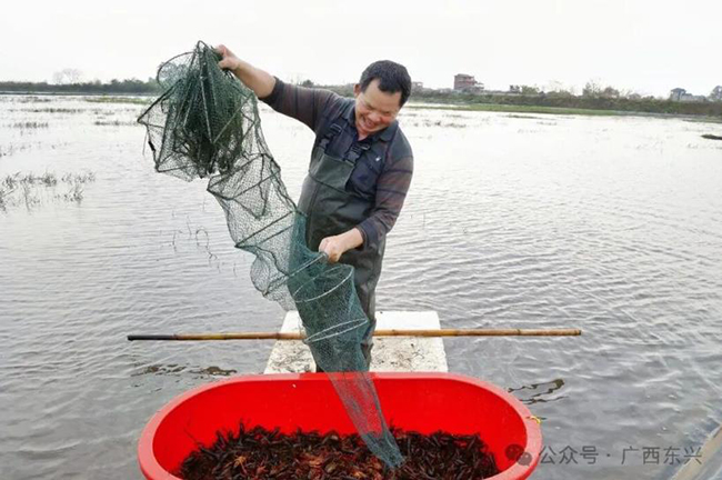 “东兴气候温暖湿润、水质优良,在这里养小龙虾,可以实现反季节上市,有价格优势。”望向基地,广西万融农业投资有限公司总经理李豪峰回忆道,眼前这片土地曾是盐碱地,因耕种效益低而几近撂荒。2025年,公司租赁了吒祖村的480亩闲置耕地,通过土壤改良、连片整合、农田水利配套等措施将“闲田”变“良田”,着力打造稻虾共养的立体生态农业模式。在该模式中,水稻为小龙虾提供栖息和躲避天敌的生长环境,小龙虾则以稻田中的害虫、杂草等为食,其排泄物可提升土壤肥力。互利共生的生态循环有助于实现“一水两用、一田双收”的集约效益。