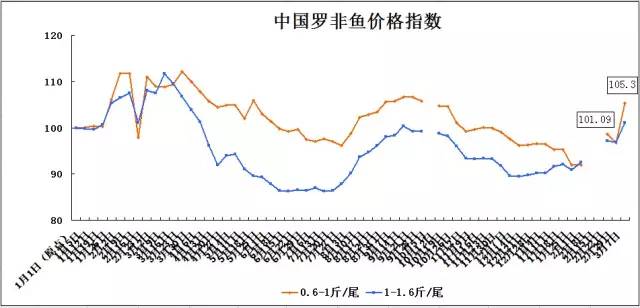 2016年3月7日,中国罗非鱼价格指数收报点如下:0.6-1斤/尾规格指数收报点105.3,比上一统计日(2月29日)上调8.55点;1-1.6斤/尾规格指数收报点101.09,比上一统计日上调4.26点。