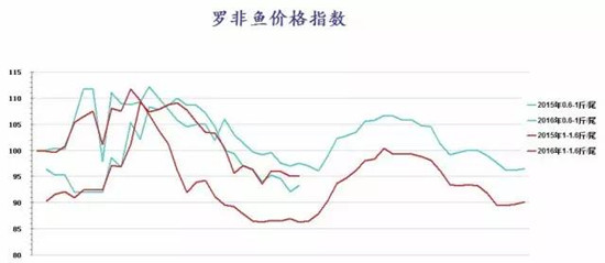 2016年7月11日,中国罗非鱼价格指数收报点如下:0.6-1斤/尾规格指数收报93.37点,比上一统计日(7月4日)上调1.27点;1-1.6斤/尾规格指数收报95.16点,比上一统日上调0.08点。同比去年,0.6-1斤/尾规格指数低4.19点,1-1.6斤/尾规格指数高8.91点。