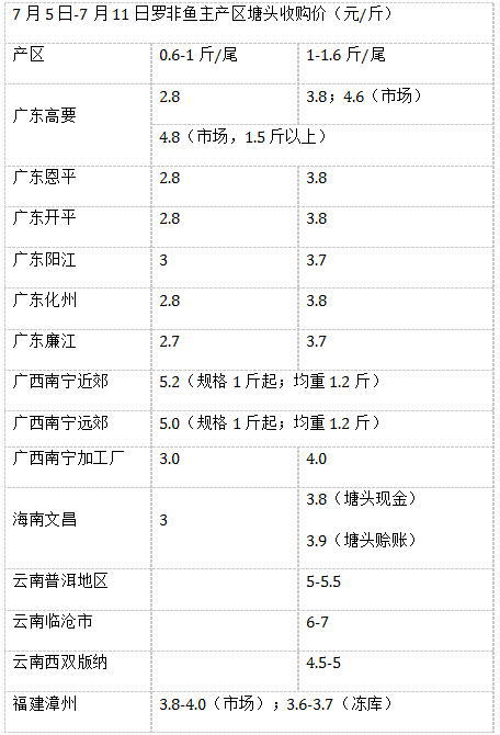 两广、海南及云南、福建产区,整体鱼价呈现稳中有升迹象,其中广东珠三角本周价位集中在2.8/3.8元/斤,环比上调0.1元/斤。全国罗非鱼主产区塘头具体报价如下表: