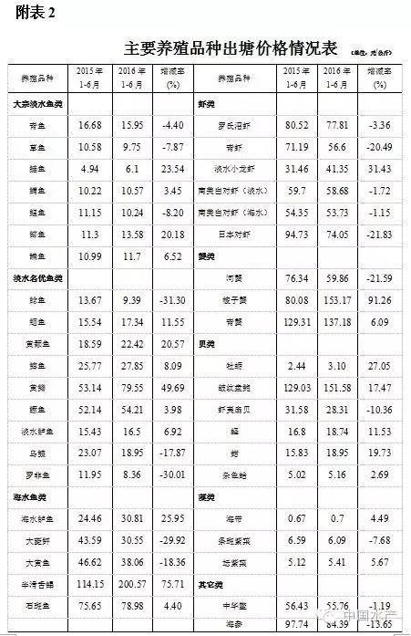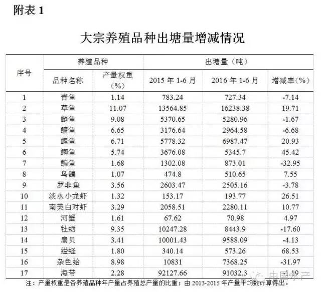根据16个水产养殖主产省(区)、200个养殖渔情信息采集定点县、785个采集点、6000多个采集终端,1-6月上报养殖渔情数据,以及全国养殖渔情专家春季调研和会商情况来看,总体上,2016年上半年我国水产养殖开局稳定,多数养殖品种生产呈企稳态势,放养面积和苗种投放稳中有增,但个别品种生产形势仍不容乐观。养殖成本继续上升,寒潮、洪涝等灾情影响有待进一步关注。具体情况如下: