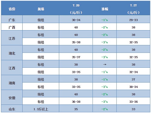外省受广东市场价格影响,本周也出现大面积下跌,短期内预计很难回升。