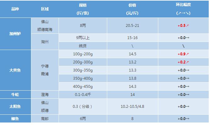 加州鲈:湖州区域高温天气,加州鲈不耐运输。佛山顺德、南海区域近期病害严重,出现烂身,烂嘴,烂尾,诺卡氏等现象,持续高温导致蓝藻暴发。