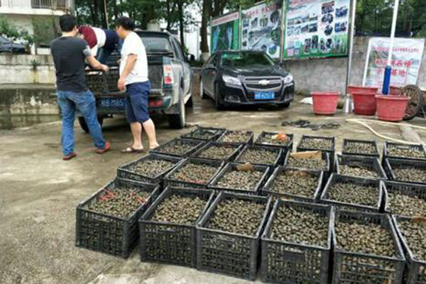 合作社给养殖户分发田螺种