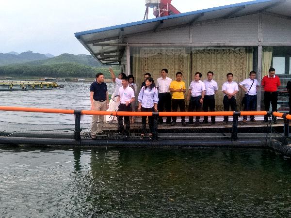 区长杨世爵(左一)率队到隆林万峰湖大水面养殖基地考察学习