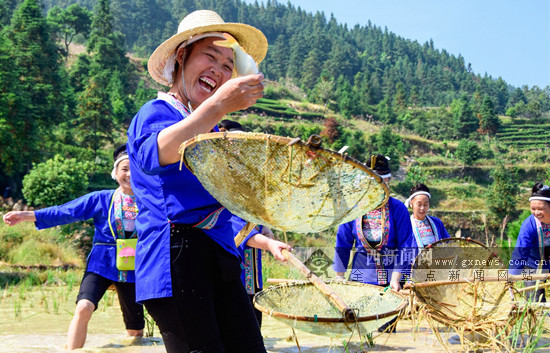 稻田养鱼可以促进水稻增产。稻田养鱼是一种扩大再生产,是对国土资源的再利用,不需额外占用耕地就可以生产水产品。图为广西柳州市三江县的侗族同胞在稻田里打捞到鲤鱼时,情不自禁地露出兴奋的表情。唐汉忠 摄