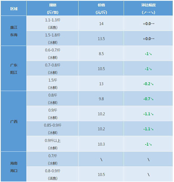 廉江东海区域:本周鱼价稳定。规格0.8-1(活鲜)11-12元/斤,鱼排和深水网箱春鱼规格普遍在5两-7.5两,暂时没有出鱼。