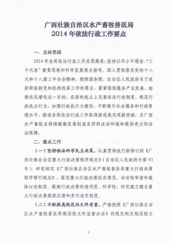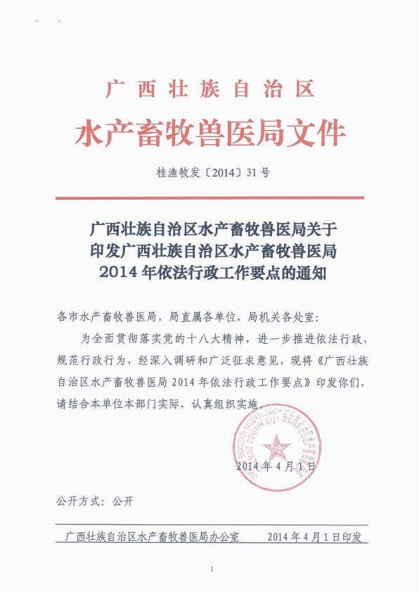 关于印发广西壮族自治区水产畜牧兽医局2014年依法行政工作要点的通知(桂渔牧发[2014]31号)
