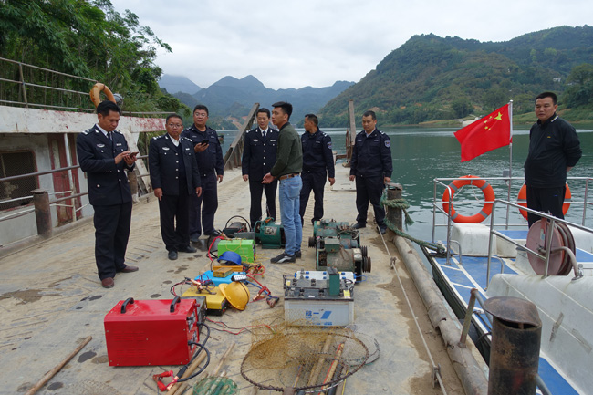 联合执法组乘坐两艘执法艇,从南丹县吾隘镇出发,沿红水河向上游对所有停靠在河边的船舶进行检查,主要检查船上是否安装电鱼设备,凡是在船上安装了电鱼设备的一律拆除,并予以没收。经过一天地毯式检查,共检查渔船和“三无船舶”160多艘,收缴发电式电鱼机6台、脉冲式电鱼机4台,电鱼配套设备电瓶4个、充电器2个、电鱼用捞网约50个、电线若干卷。
