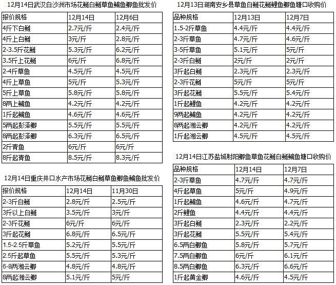 12月上半月的冷空气是今年最猛的了,从北到南都降温了,江南局部还下起了暴雪,即便是广东人也感受到了寒冬冽冽。在冷空气的推动下,各地的淡水鱼市场继续好转,主要还是体现在北方很多市场销量的增加,鱼价的上涨幅度还是比较有限的。接下来一阵子回暖的范围比较大,不过应该不会影响淡水鱼市场逐渐转好的大趋势,只是养殖户卖鱼还是等价的心态会更加复杂一些。