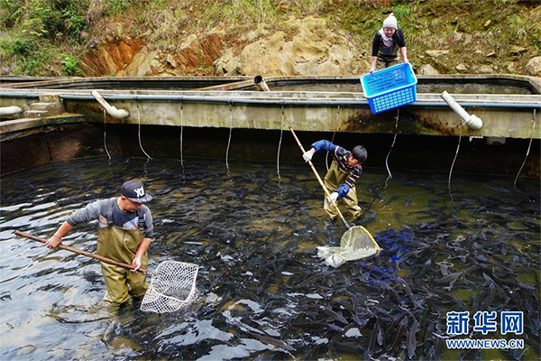“春节临近,经常有人开着车到村里来买鱼,销路很好。”在广西龙胜各族自治县龙脊镇白石村鲟鱼养殖基地,今年40岁的村民潘艳耐和丈夫正忙着捕鱼、卖鱼,一派忙碌景象。