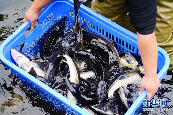 潘艳耐和工人一起在捕捞鲟鱼。新华网发 黄勇丹摄
