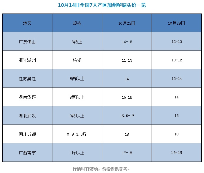 9两上报价15元/斤左右,一周内回落1.5-2元/斤左右;8两上规格的加州鲈报价14元斤,比广东同等规格加州鲈高1-2元/斤左右。天气日益转凉,加州鲈长途运输损耗减少,湖北流通商认为收鱼利润符合期望值,近日到广东拉鱼量增多。