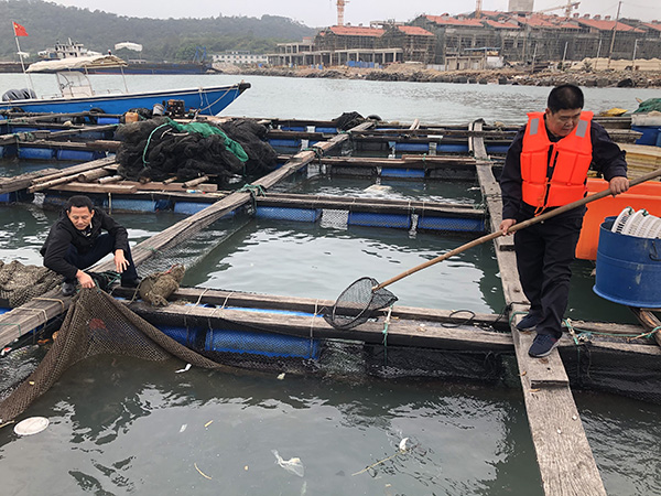 网箱清理整治是一项艰难的工作,海上时有强风大浪,每次开展排查行动,小组工作人员都是冒着风浪搭乘小型快艇登上网箱。这些简陋的网箱仅仅是通过底下的泡沫筒的浮力来支撑,人在上面行走稍有不慎就有落水的危险,并且很多网箱上都养有数只恶狗看护,更让行动小组难以靠近。除此之外,不少网箱里面还有大量的养殖鱼,养殖户强烈要求要等其清空完网箱内的鱼货后再拆除网箱。尽管排查工作十分辛苦,但是管理中心和渔政支队的工作人员依旧坚持认真按照分片分区、先易后难的原则开展整治工作。