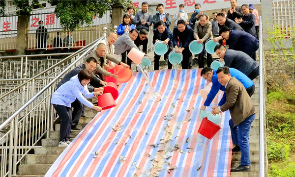 在风景如画的马步水库,随着大家把一桶桶鱼苗倒入湖里,一万余尾大头鱼、草鱼和鲤鱼找到了新家,鱼儿们争相跃入水中,场面尤为壮观。