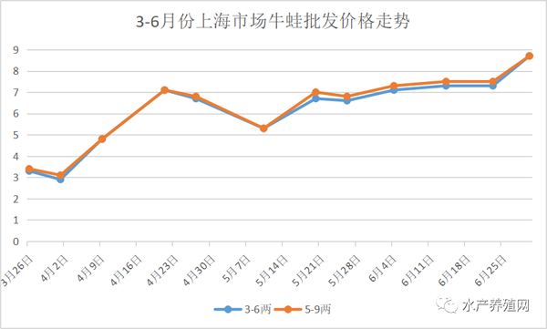 3-6月上海市场牛蛙批发价走势,单位:元/斤