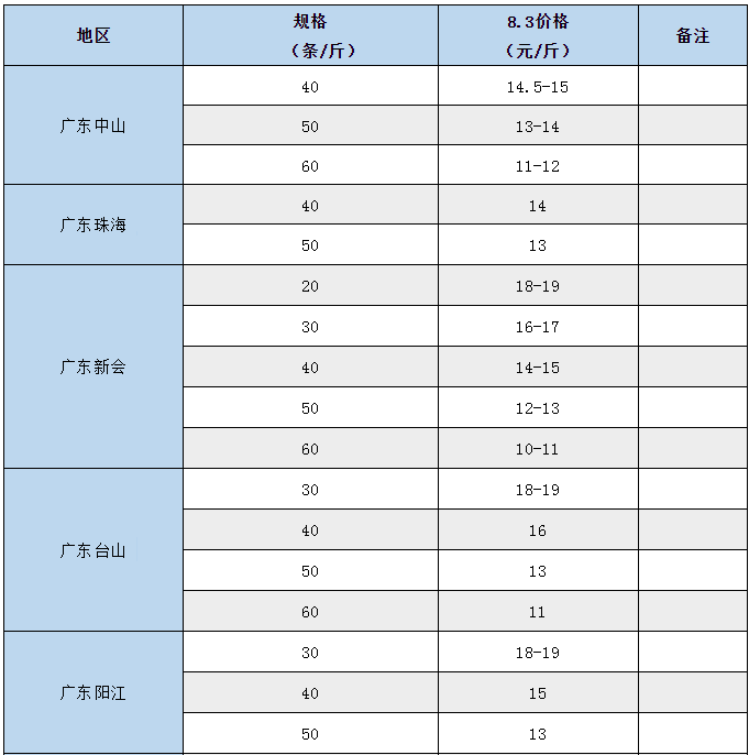 从8月3日南美白对虾各个地区塘口的收购价来看,以40条规格为例,珠三角价格14-15元/斤,粤西地区15元/斤,广西防城15.8元/斤,海南海口16元/斤,福建龙海16元/斤,浙江萧山23元/斤,山东东营16-17元/斤。从价格方面上来看,华东要比华南地区高一些。目前多地价格已经处于止跌状态,甚至有部分地区的价格却比上周略有上涨。由于现在餐饮行业生意开始好转,水产品的市场需求量也有显著上升,加上前段时间病虾多而提前上市,还是以低价抛售,现在存塘的对虾不多。如今出现了供不应求的局面,所以价格将会上涨到合理的价位。