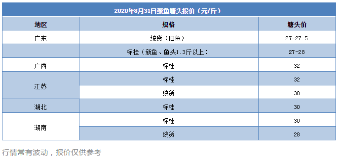 6两上鲈鱼老鱼报价17元/斤左右,一周内鱼价基本持稳,由于在沙头的存塘老鱼不足百塘,加上近期气温较高,养户出鱼积极性一般;新鱼方面,出塘规格从7两上抓起偏多,鱼头的1.4-1.5斤左右,报14-14.5元/斤,价格一周内基本持稳,一部分养户仍看涨后市,计划9月份后再卖。