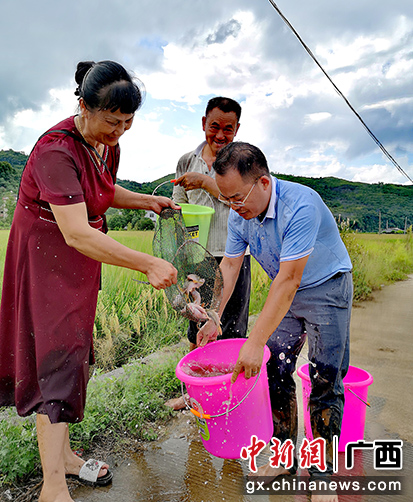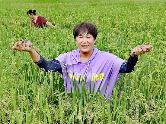 图为工人在田中捉鱼。陆仕臣 摄