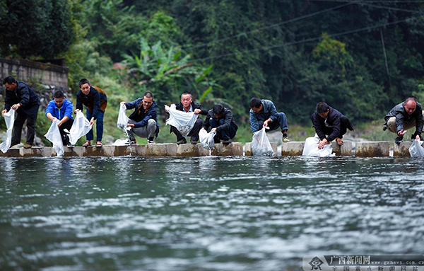 村民正在投放鱼苗。广西新闻网通讯员 杨仁涛 摄