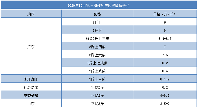 10月第三周,全国黑鱼行情继续呈下行趋势,比起9月中旬下跌了近1元/斤。因为后市行情不明朗,近期广东养户卖鱼意愿较大,使得流通商可选择性多,为保证自身利益,流通商开价只会越来越低,有些养户在开网当天被压价一毛也是有发生的;而实际上流通商手上的鱼并不多,但也不敢大量开鱼,因为担心接下来鱼价下行给自己带来利益损失。到目前为止,全国黑鱼塘头价最高在9元/斤,广东产区价格最低,山东产区挑公的鱼价格则可达到10元/斤以上。
