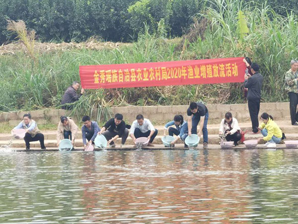 为有效恢复和增殖天然水域渔业资源种群数量,保护我县水域生态环境和生物多样性,推动我县河流域生态保护,保持我县渔业可持续发展,2020年10月30日,县农业农村局在金秀镇河口电站河流、桐木镇桐木河、长垌乡圣堂湖、三角乡甲江河开展了“2020年渔业资源增殖放流活动”,本次放流活动共投放草鱼、青鱼、鲤鱼约80万尾。参加活动人员有县农业农村局局长覃会雅、县农业综合行政执法大队执法人员、县动物疫病预防控制中心及涉及到的乡镇人民政府主要领导及相关工作人员、群众代表等。