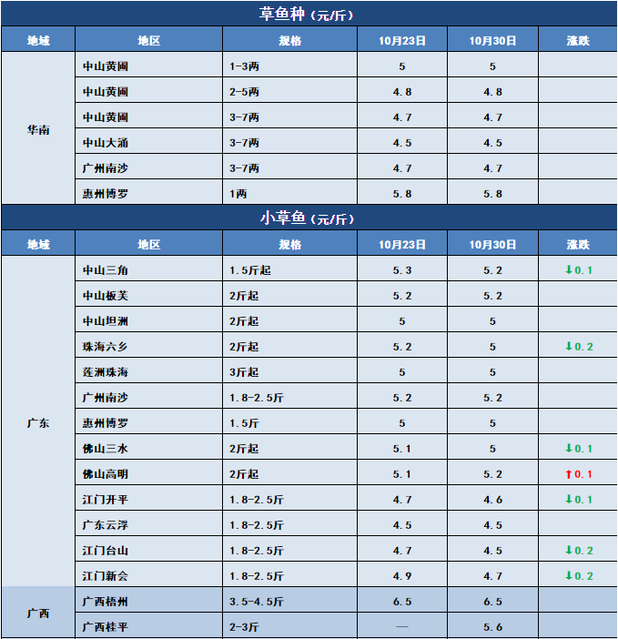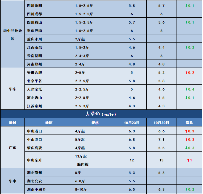 小草鱼:广东中山本区域草鱼超市皖价钱同上周持平,预计暂时价格不会跌落太快。广东珠海价格有所下滑,气温下降,大量养户出鱼,但总体存塘量少,后市可期。湖南常德由于近期走鱼速度加快,市场消化能力减慢,价格出现轻微的下滑。