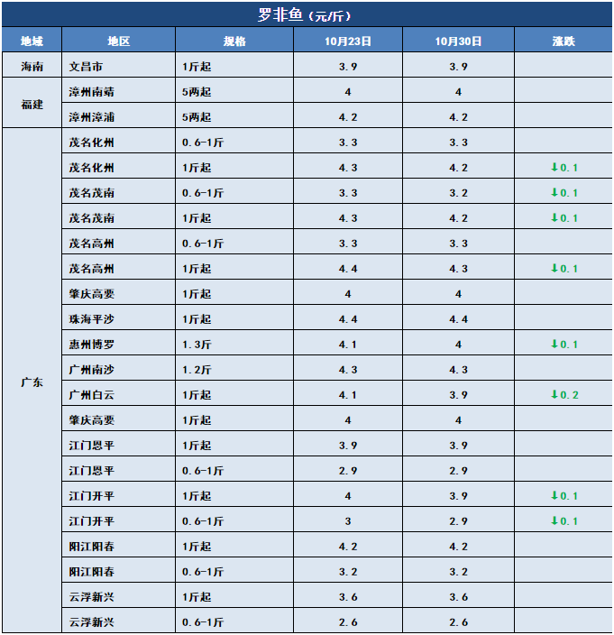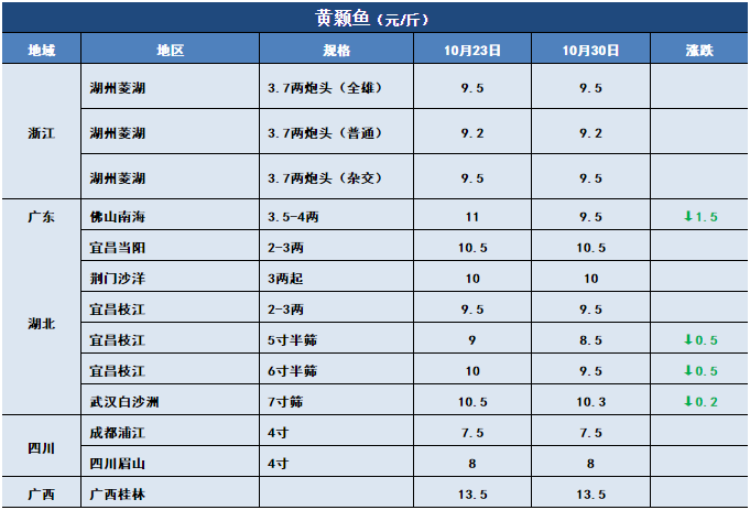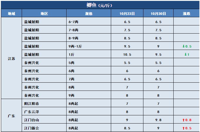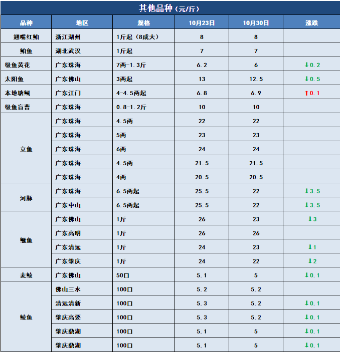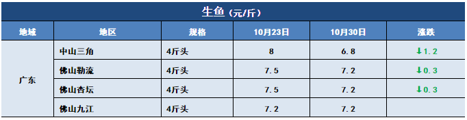广东佛山:目前新鱼的价格低,3.5两头、6寸筛上的鱼价在8.5元/斤左右;4两头的新鱼价格在9.2-9.5元/斤、主要看大鱼成数。旧鱼价格还相对稳定,在11.5元/斤左右,大鱼比例高的可以再多0.2-0.3元/斤。新鱼鱼价主要受外省车还没怎么有下来的原因影响,预计到11月份才会多车。