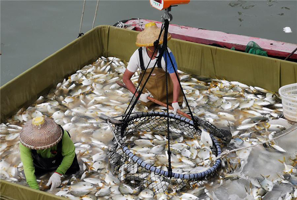 11月1日,在防城区江山镇白龙码头,工人们正忙着把捕捞回来的金鲳鱼运送上岸。白龙珍珠湾离岸深水海域非常适合养殖金鲳鱼,眼下又正值收鱼旺季,每天均有大量金鲳鱼从这里上岸。从船舱里卸下的金鲳鱼,经过挑拣、过磅、包装、装上车,经过冷链物流销往全国各地。