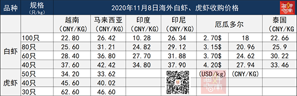 注:以上产品为当地虾类的塘头收购价,汇率按当地货币实时兑换人民币计算