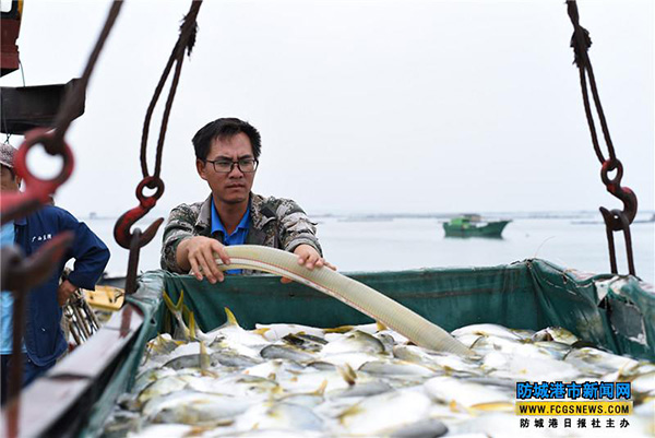 11月17日,在防城区白龙珍珠湾,广西蓝湾旅游有限公司工人正在给刚捕捞上岸的金鲳鱼加水。