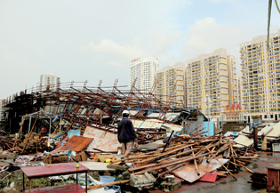 7月20日,海南海口市龙华区一处建筑工地上,一名工人走过被台风摧毁的工棚。当日,超强台风“威马逊”登陆海南48小时后,记者用镜头记录下海口市的景象。