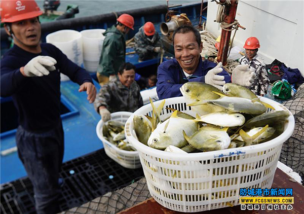 12月11日上午,在防城区江山镇白龙珍珠湾,一艘装满金鲳鱼的渔船停靠在岸边,广西海牧海洋科技有限公司的工人正忙着将金鲳鱼运到岸上。经过称重、包装后,金鲳鱼将由冷链车运送至广东湛江,当天即可在湛江市场上市。